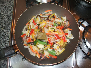 Acompanhei com mistura de legumes chineses salteados numa frigideira, com um caldo de legumes.